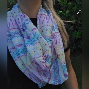 Brighten up your wardrobe with this lightweight infinity scarf featuring a vibrant geometric/tribal-inspired pattern in shades of blue, purple, pink, and yellow. Perfect for layering in any season, this versatile scarf adds a fun pop of color to casual or dressy outfits.
