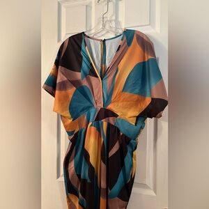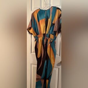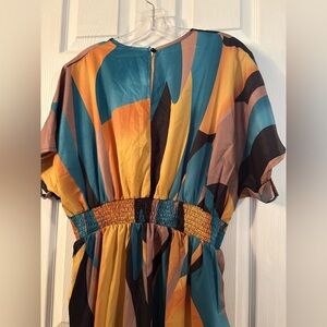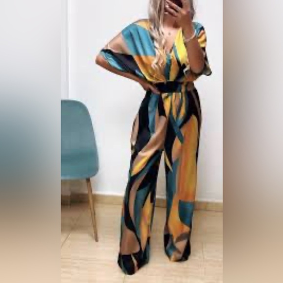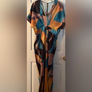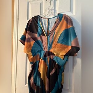 Vibrant jumpsuit with geometric patterns. Features shades of blue, orange, and black.