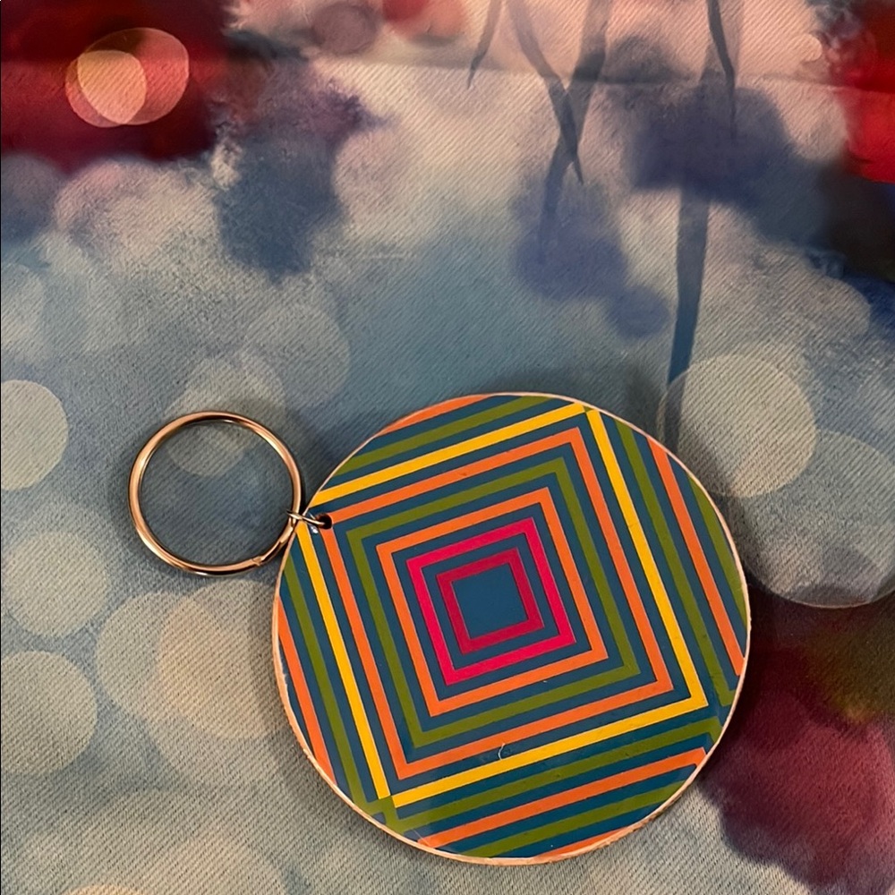 Add a pop of color to your keys with this vibrant geometric keychain. Featuring a striking design in blue, pink, and orange, it's a stylish accessory for any set of keys.