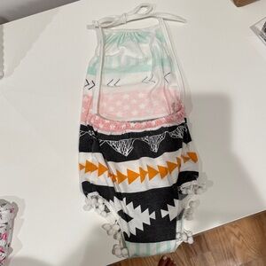 This vibrant kids halter onesie features a playful geometric design in pink, orange, and black. Perfect for adding a splash of color .
