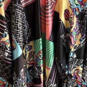 Vibrant kimono robe with geometric patterns. Features a mix of colors including pink, green, yellow, and black. Perfect for adding a pop of color to your wardrobe.
