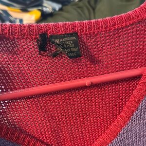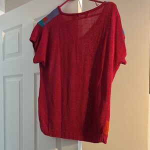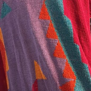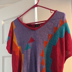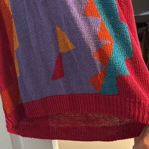Vibrant knit top with geometric patterns. Features red, purple, teal, and orange colors.