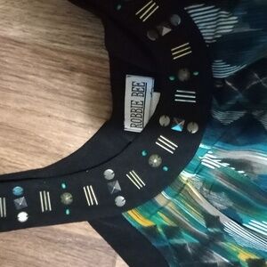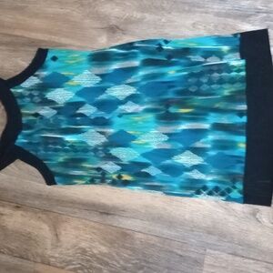 Vibrant ladies dress featuring a Geometric Pattern in Blue, Green, and Black Spring or Summer Sleeveless Casual or Date Night Perfect for any occasion.