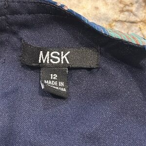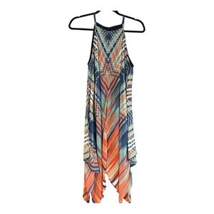 Vibrant maxi dress with geometric patterns. Features shades of blue, orange, and cream. Perfect for a stylish look.
