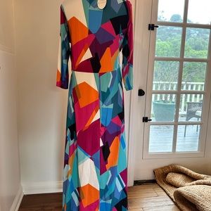 Embrace vibrant style with this colorful geometric maxi dress. Perfect for any occasion, this dress features a stunning mix of colors that will make you stand out.