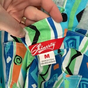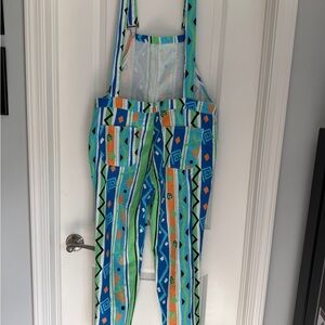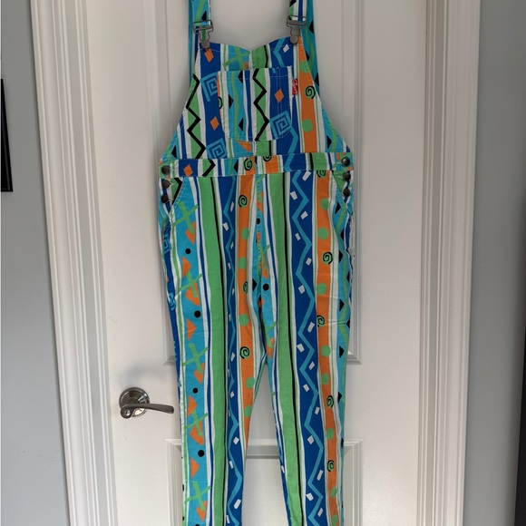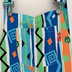 Bright and playful overalls featuring a vibrant geometric pattern. Perfect for adding a splash of color to your wardrobe.