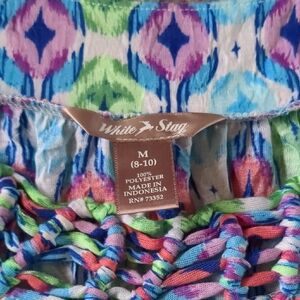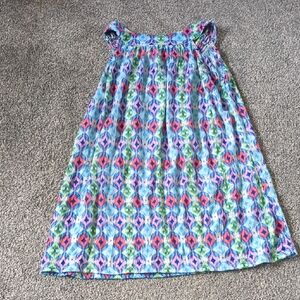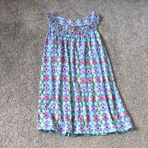 Vibrant shirt with a geometric pattern. Features a mix of blue, pink, and green colors. Perfect for a casual outing.
