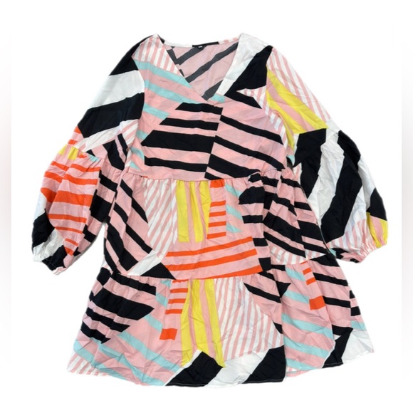 Vibrant dress with geometric patterns. Features pink, black, yellow, and orange colors. Perfect for a bold look. #002-024