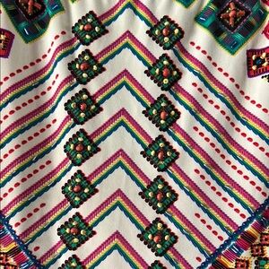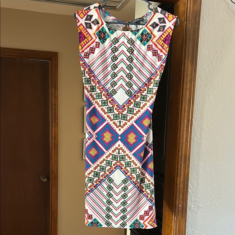 Vibrant vintage dress featuring a colorful geometric pattern. Perfect for making a statement. Beaded in the front!