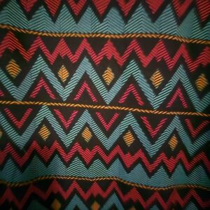 Vibrant dress with a geometric pattern. Features pink, green, and black colors.