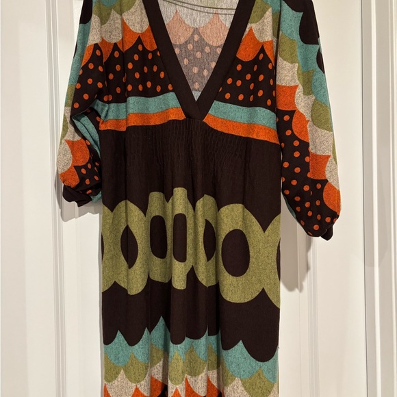 Vibrant dress with a bold geometric pattern. Features a mix of orange, green, and black colors. Perfect for making a statement.