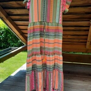 Vibrant dress with geometric patterns. Features shades of green, pink, and orange. Perfect for a bold look.
