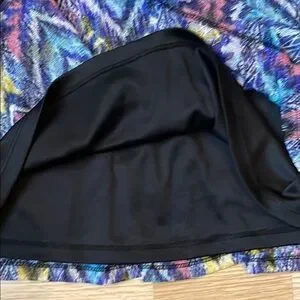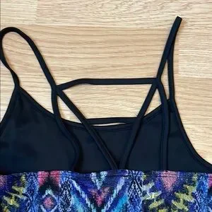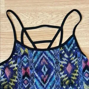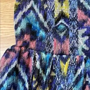 Vibrant dress with a geometric pattern. Features a mix of blue, purple, and black colors. Perfect for casual outings.