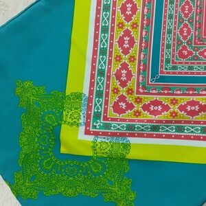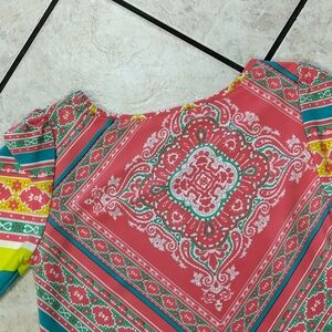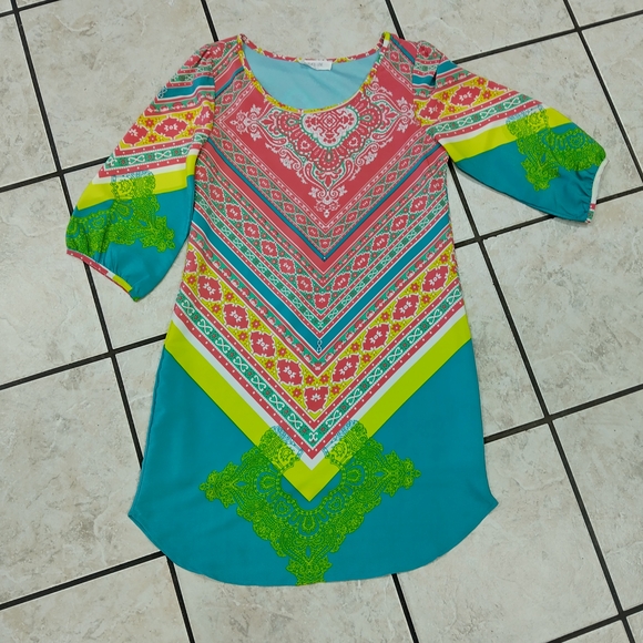 Vibrant dress with geometric patterns. Features pink, green, and teal colors. Perfect for a bold look.