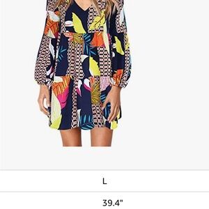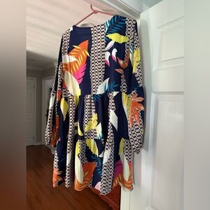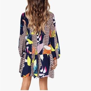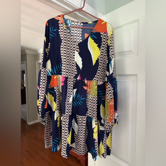 Vibrant dress with geometric patterns in navy, orange, yellow, and white. Perfect for a bold look. Super comfy!