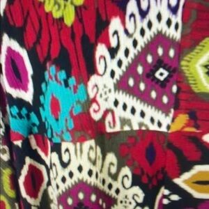 Vibrant dress with a geometric pattern. Features a mix of colors including red, green, and purple.