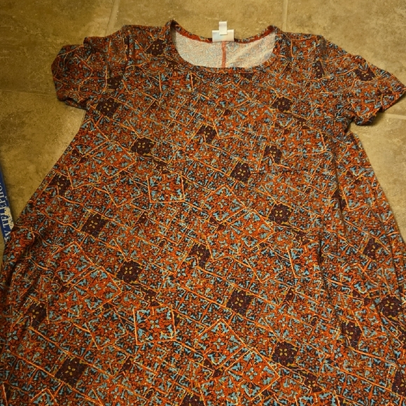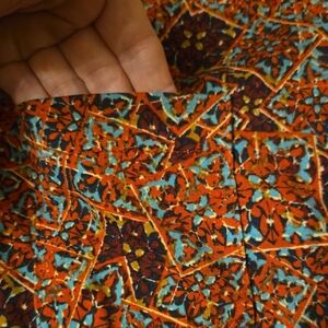 Vibrant dress with a geometric pattern. Features a mix of orange, blue, and brown colors.