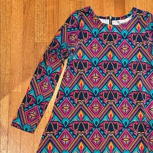 Vibrant dress with a geometric pattern. Features a mix of blue, pink, and orange colors. Perfect for a bold look, 34 inch length, 18 inches pit to pit, 20 inch waist, 26 inch hips.
