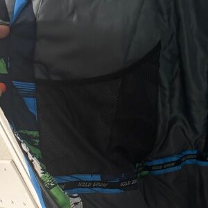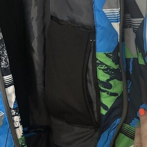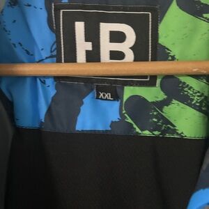 Vibrant jacket with geometric patterns in blue, green, and black. Perfect for a bold look.