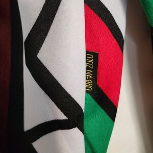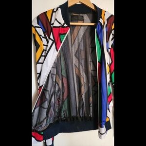 Vibrant jacket with geometric patterns. Features red, blue, green, yellow, and black colors. Perfect for a bold fashion statement.