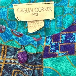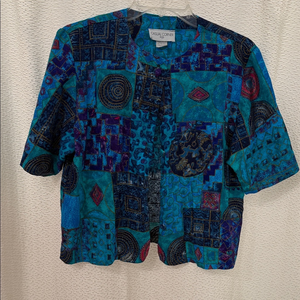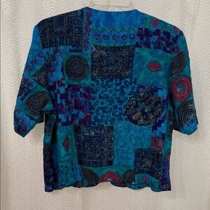 Vibrant jacket with a geometric pattern in blue and teal. Perfect for adding a pop of color to any outfit.could also wear as a blouse. Covered buttons. PTP 20”, length 21”.