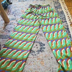 Vibrant pants with a geometric pattern. Features green, blue, red, and white colors. Perfect for a bold look.