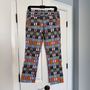 Vibrant pants with a geometric pattern. Features orange, blue, and black colors.