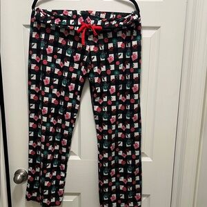 Vibrant pants with a geometric pattern. Features black, pink, and green colors.
