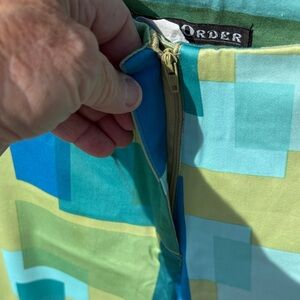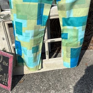 Vibrant pants with a geometric pattern color block in shades of blue and green. Perfect for a bold fashion statement.