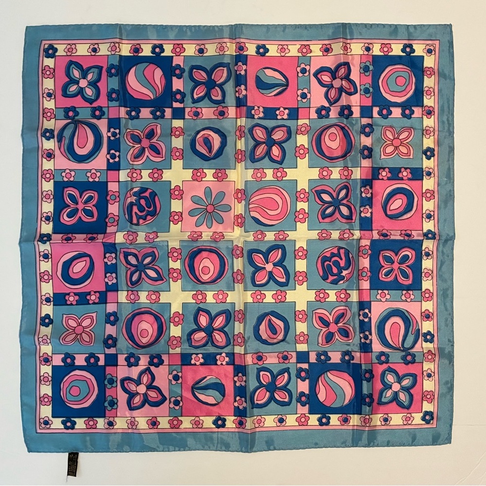 Vibrant scarf with geometric patterns in pink, blue, and cream. Perfect for adding a pop of color to any outfit. Scarf made in Japan from acetate. Measures 22 inches by 22 inches.