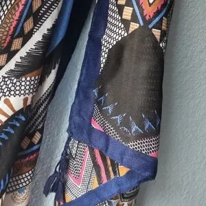 Vibrant scarf with geometric patterns. Features blue, black, and orange hues.