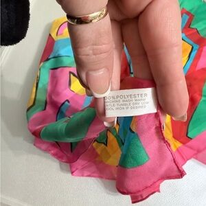Vibrant scarf with geometric patterns. Features pink, yellow, blue, and green colors.