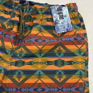 Vibrant shorts with a geometric pattern. Features shades of orange, green, and blue.