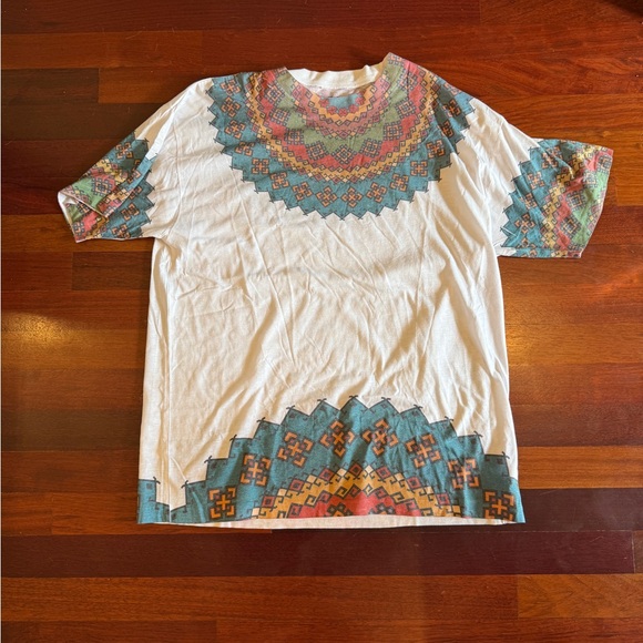 Vibrant t-shirt with geometric patterns. Features blue, orange, and pink designs on a white base. Perfect for casual wear.