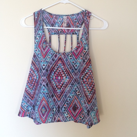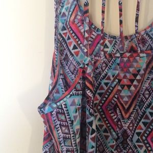 Super cute, loose fitting tank from (I think) PacSun. Worn maybe 3 times! Very lightweight synthetic material - NEVER WRINKLES! Open back with vertical straps. It's very breezy and hits right at your waistline 💕