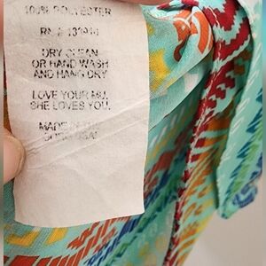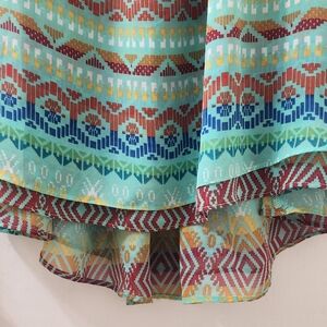 Vibrant tank top with geometric patterns. Features shades of blue, green, and brown. Perfect for casual wear.