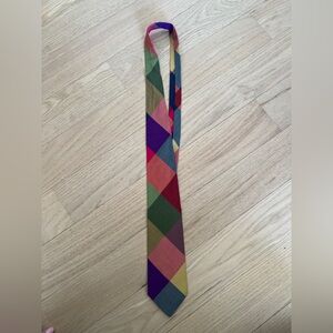 Vibrant tie with a geometric pattern. Features shades of red, green, purple, and blue.