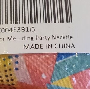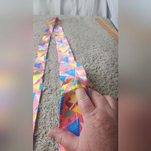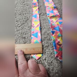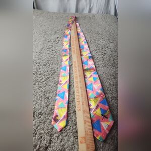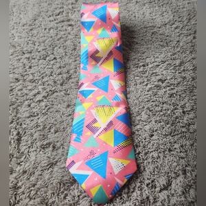 Vibrant tie with a geometric pattern. Features pink, blue, yellow, and green colors.