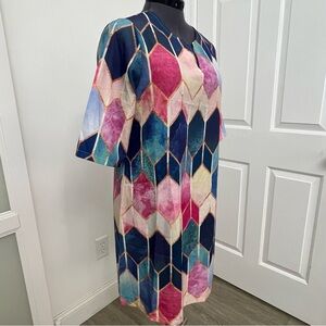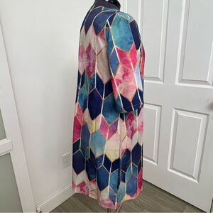 Vibrant top with a geometric pattern. Features shades of blue, pink, and cream. 100% Polyester Size XL