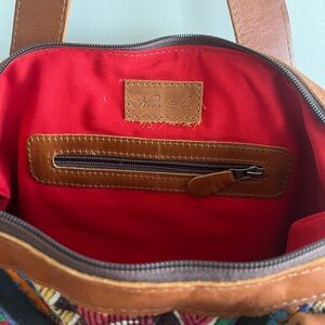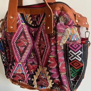 Vibrant tote with geometric patterns. Features leather handles and trim. Side pockets for extra storage.