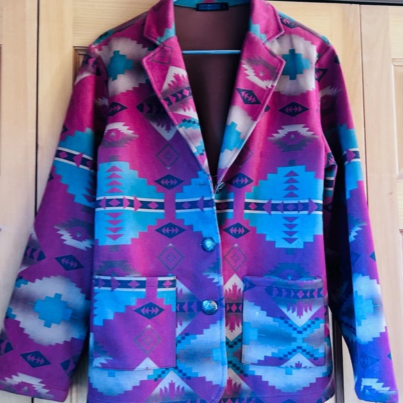 Stand out with this vibrant women's jacket featuring a striking geometric pattern. Perfect for adding a pop of color to any outfit.