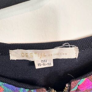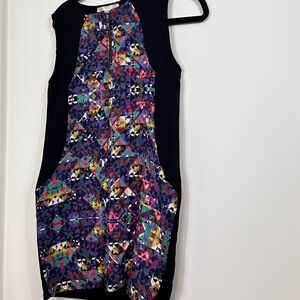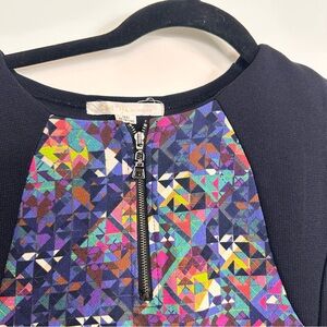 Vibrant dress with a geometric pattern. Features a mix of colors including purple, blue, and pink. Worn gently