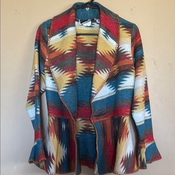 Vibrant cardigan with geometric patterns. Open front design. Perfect for layering.
