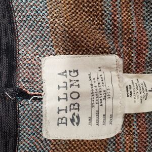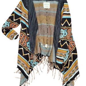 Vibrant cardigan with geometric patterns. Features black, orange, blue, and tan colors. Perfect for adding a pop of color to any outfit.