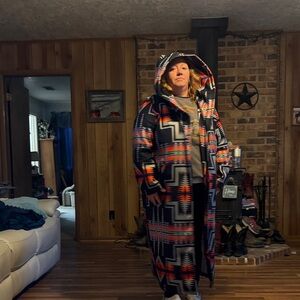Vibrant coat with geometric patterns. Features red, blue, and black colors. Perfect for a bold look.
