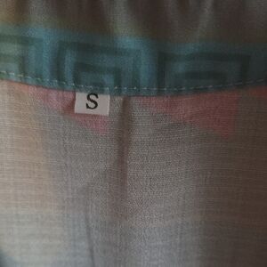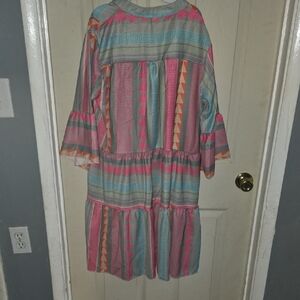 Vibrant dress with geometric patterns in pink, orange, and blue. Features a loose fit and three-quarter sleeves.