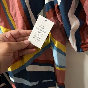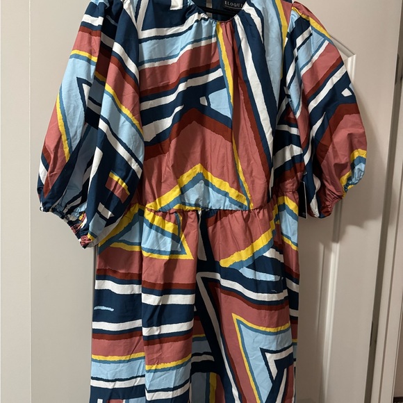 Vibrant dress with geometric patterns. Features blue, red, and yellow colors. Perfect for a bold look.