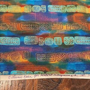 Vibrant Sherril Kahn for Robert Kauffman fabric with a geometric pattern. Features shades of orange, blue, purple, orange and gold, 41” x 34”.