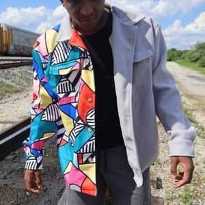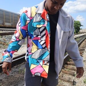 Vibrant jacket with a bold geometric pattern. Features a mix of blue, red, pink, yellow, and black colors. Perfect for making a statement.