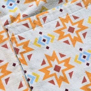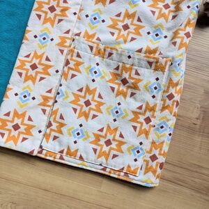A hand sewn oversized open jacket with a geometric star pattern. Includes orange, cream, and blue colors in a soft and cozy double layer of cotton flannel fabric. Features deep pockets outside and inside the jacket on both sides, for a total of 4 pockets. It's a great jacket for carrying your necessities on a walk out, or even for a cozy day in. Since it's oversized, I'd say it fits a small to a medium comfortably. Gently worn with light overall pilling that happens to cotton flannel with minimal wear. You can see the detail pic of the print & fabric for reference. Comes from a pet and smoke free home.